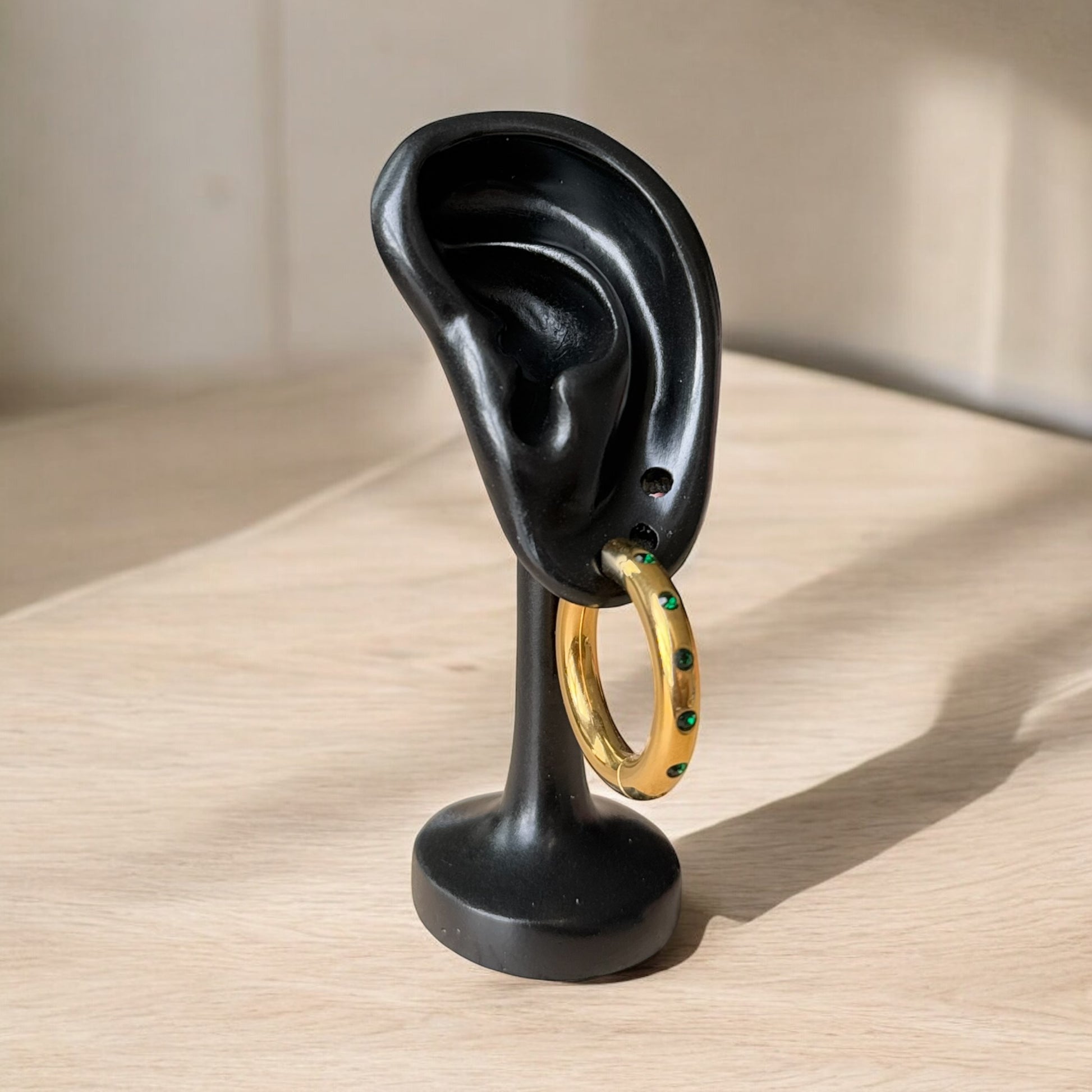 Minimal gold hoops punctuated with emerald stone dots—this is quiet luxury with an edge.