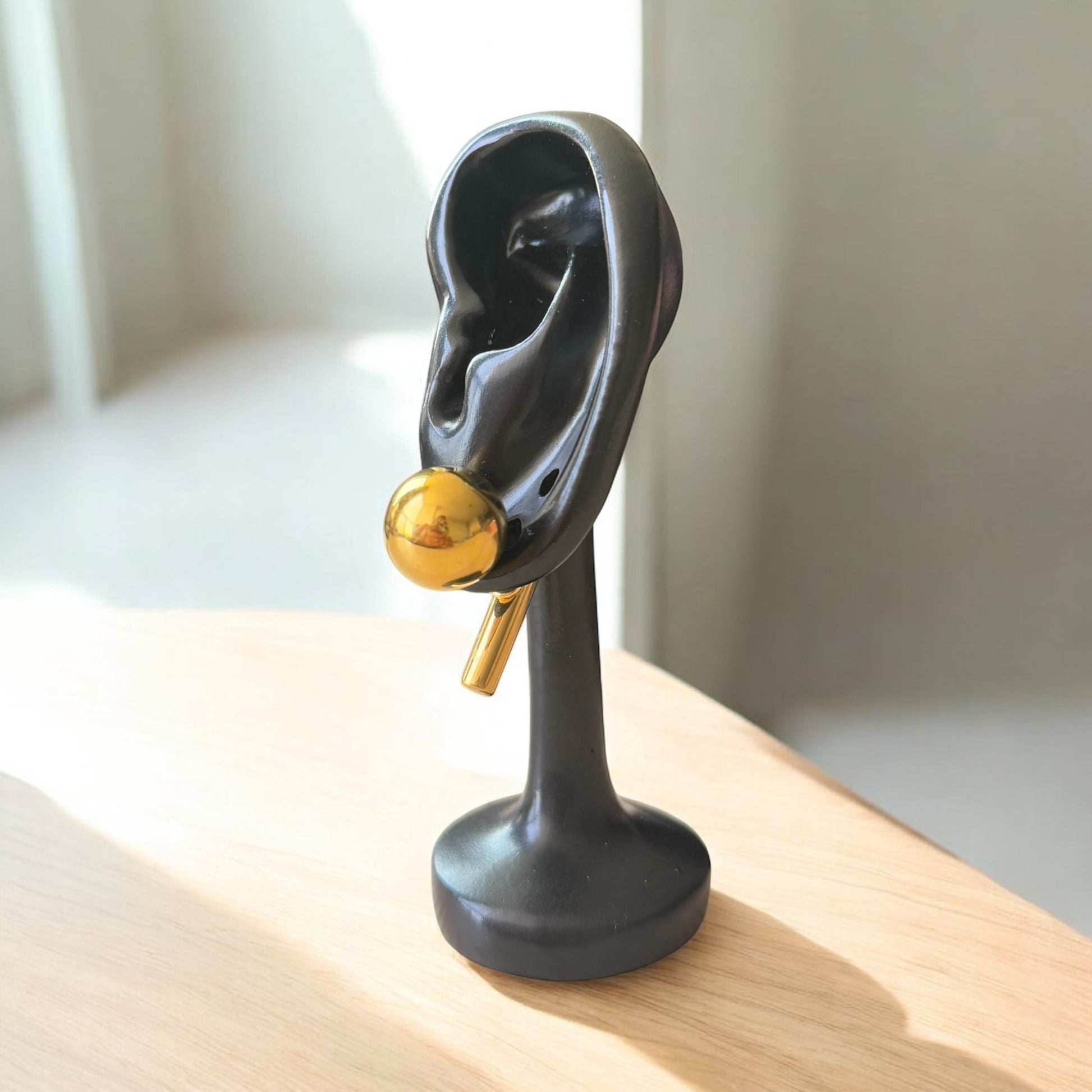 A sculptural mix of spheres and bars in high-polish gold, bringing a futuristic vintage energy to your lobe.